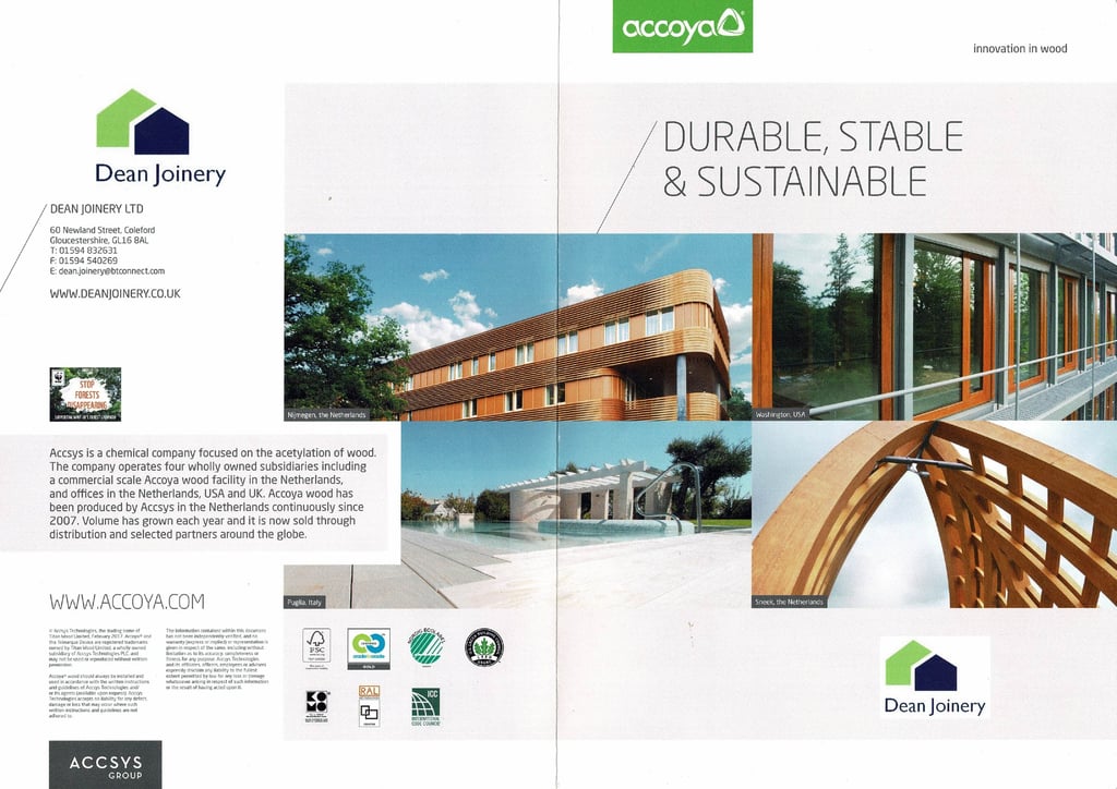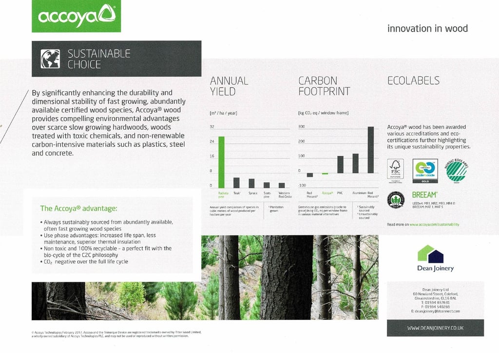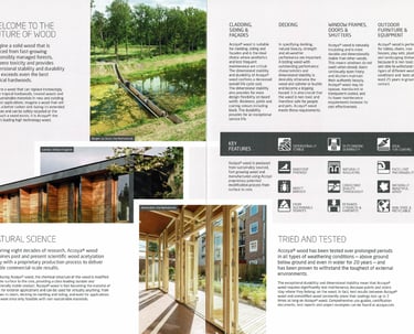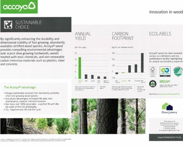 Accoya long life modified wood has become the timber industry benchmark for performance and sustainability. No other timber can offer this combination of stability, durability and versatility. This modified wood is sustainably sourced with FSCĀ® certification and it has minimal environmental impact throughout its entire life; from production, through its use, right the way to the end of its life.